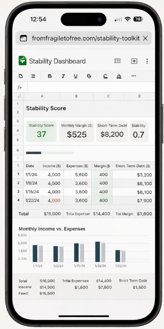 The Stability Toolkit includes practical worksheets and calculators designed to help you reduce fragility, build margin, and design financial optionality. This toolkit includes: